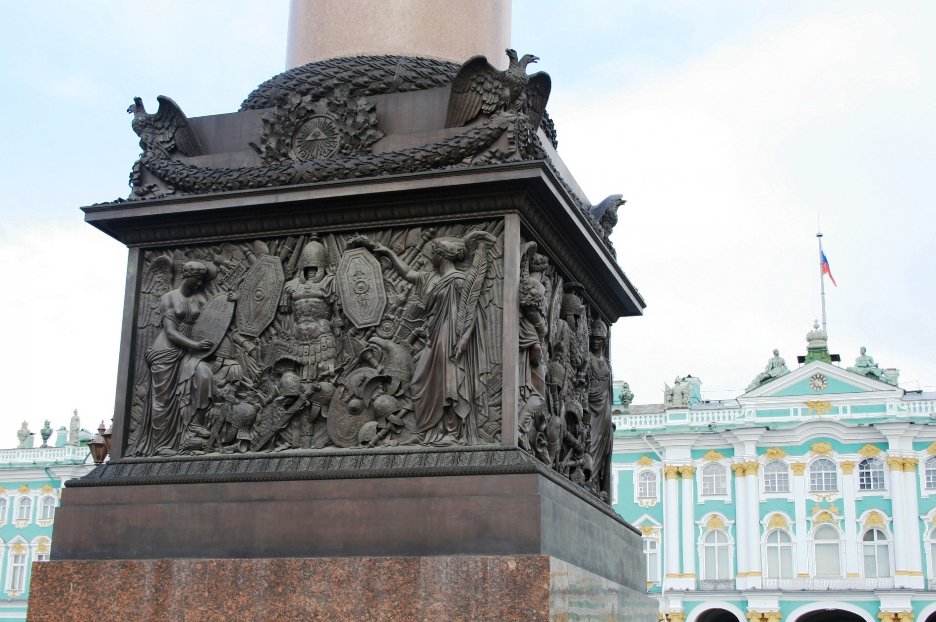 Today we admire not only the impressive overall view of the column but also gorgeous details. Chiselled bas-reliefs made of bronze on its basement made according to drawings of Montferrand himself. Another magnificent detail is on the very top of the column—the figure of Angel with a cross which looks very tiny from the ground but actually is 6.5 meters in total. The angel face features remind us about Alexander I, emperor-the winner, however not so many were lucky enough to climb so high and see it.